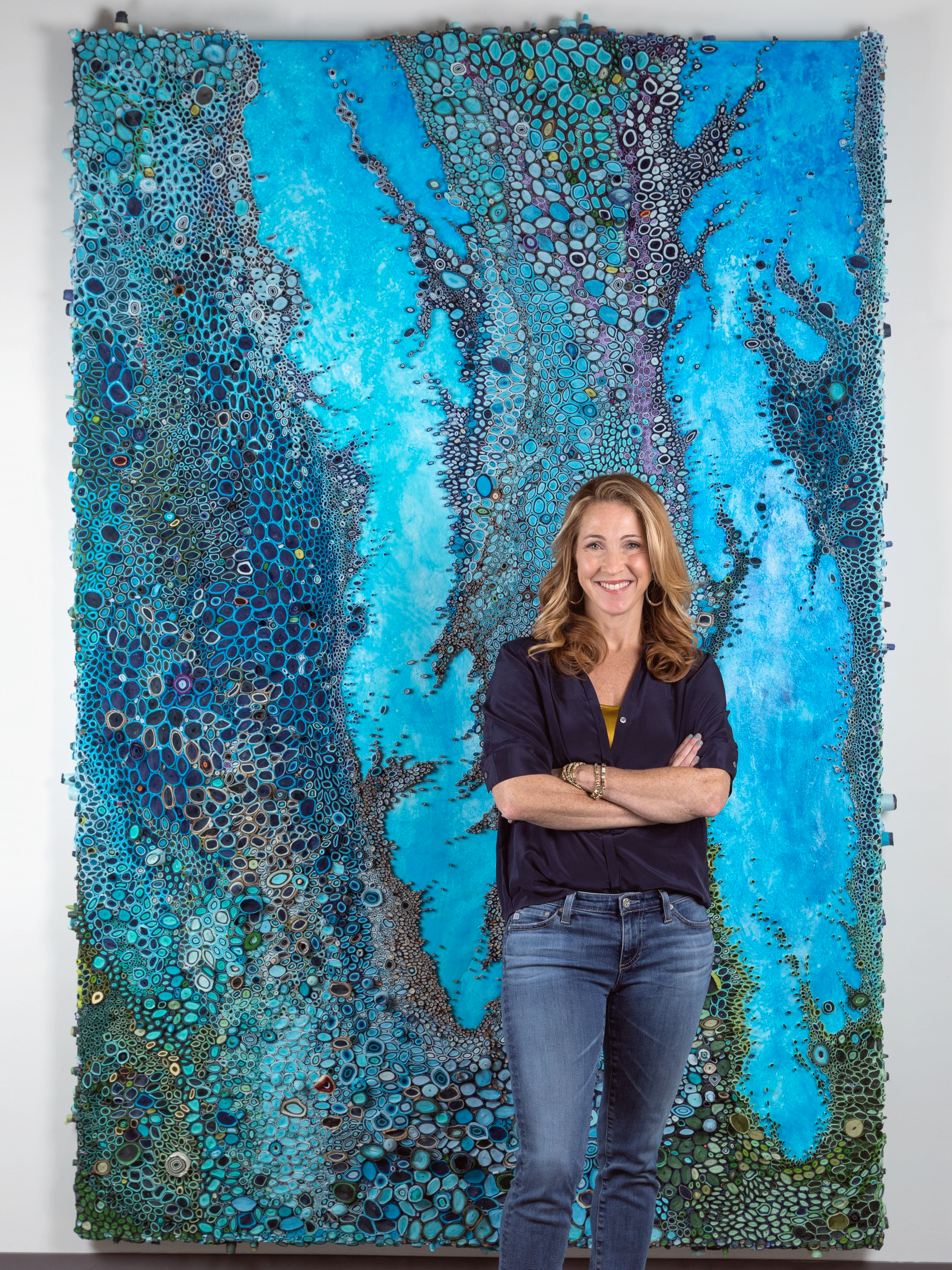Amy Genser plays with paper and paint to explore her fascination and obsession with texture, pattern, and color. Evocative of natural forms and organic processes, her work is both irregular and ordered. She constructs her pieces by layering, cutting, rolling, and combining paper. Amy uses paper as pigment.
